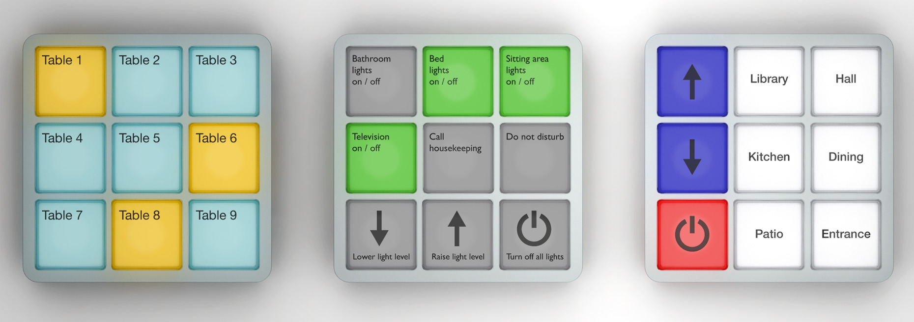 The LanBox Interface is designed to fit in any environment whether it is a bar, a restaurant of even your home. Having a surface area of only 8x8cm and a total height of 2cm, the LanBox interface houses nine illuminated push buttons. Behind every button you can insert a label with an icon or text to fit your specific requirements. We ship a standard set of labels with every product. Of course you can also print your own label sheets or send us your requests.