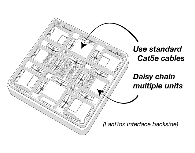 The LanBox Interface has two sets of spring operated phoenix connectors at the back. These allow for quickly connecting the wires to the LanBox Interface.