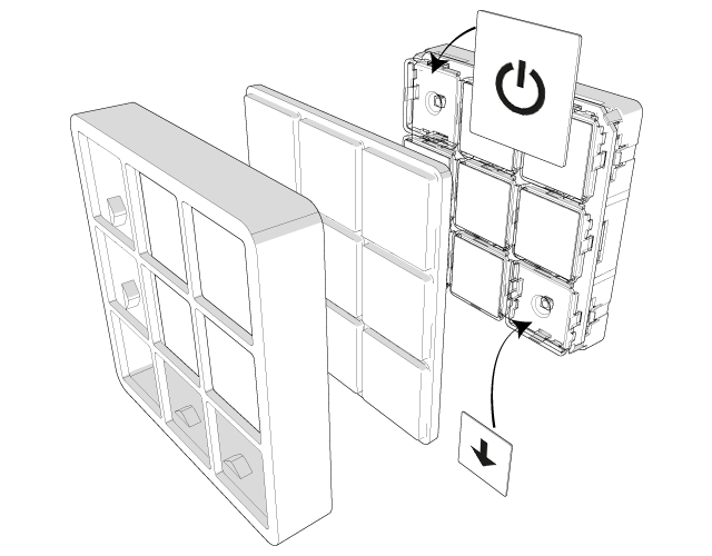 The solid aluminium housing holds the button cover. This cover is made from a soft and transparent plastic. You need to insert the labels of your choice into the housing and secure the housing on the electronics assembly using the four snap fit fasteners.