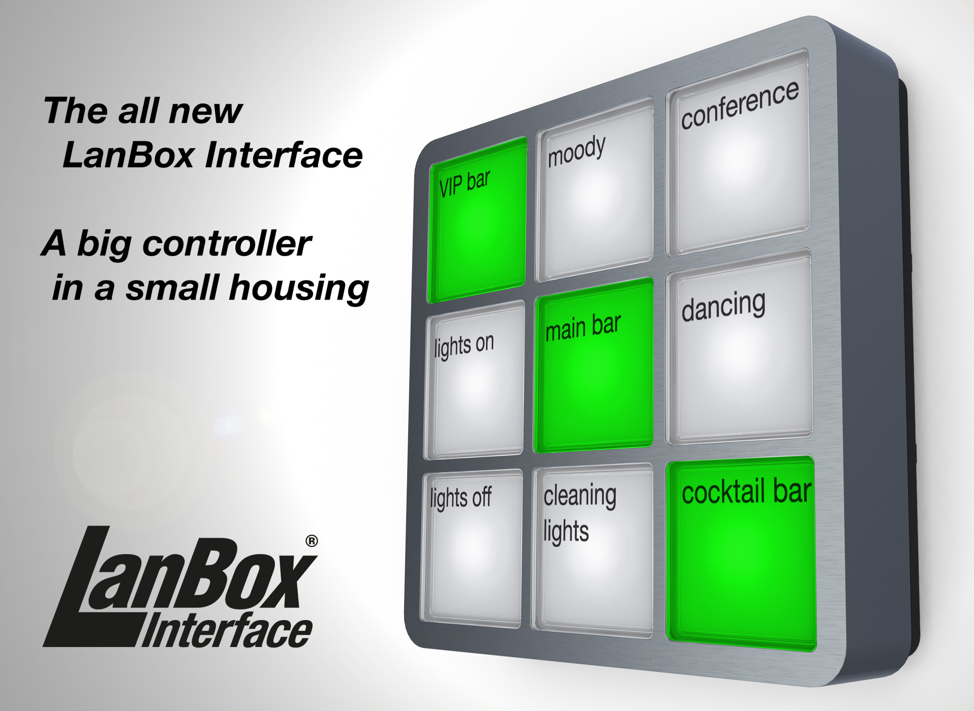 The LanBox Interface is a small and stylish control panel for use in symbiose with the current LanBox-LCX and the new LanBox-LCXi. Our philosophy about products has always been and always will be to create products that are very versatile and durable. And this also applies to the new LanBox Interface.