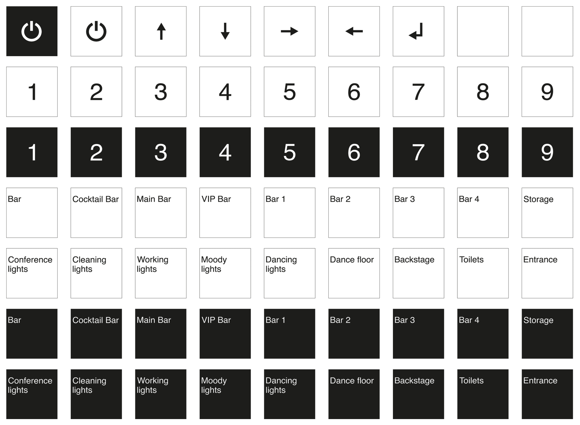 The LanBox Interface is designed to fit in any environment whether it is a bar, a restaurant of even your home. Having a surface area of only 8x8cm and a total height of 2cm, the LanBox interface houses nine illuminated push buttons. Behind every button you can insert a label with an icon or text to fit your specific requirements. We ship a standard set of labels with every product. Of course you can also print your own label sheets or send us your requests.