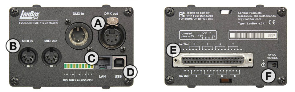 The LanBox-LCX has a DMX in- and output. (A, see picture below). The DMX output has an output patcher and different curves and slopes can be assigned per channel. The output patcher connects the 512 DMX channels to the 3072 internal mixer channels. Also, all data received from for example the DMX input can be assigned to any one of the 3072 mixer channels. Using the abundant amount of internal channels, it is possible to use extensive programming. The MIDI ports (B) can both send and receive any type of Controller, Note and SysEx message where all these messages can be assigned to individual mixer channels and cues.