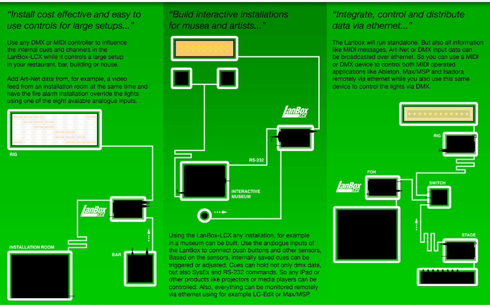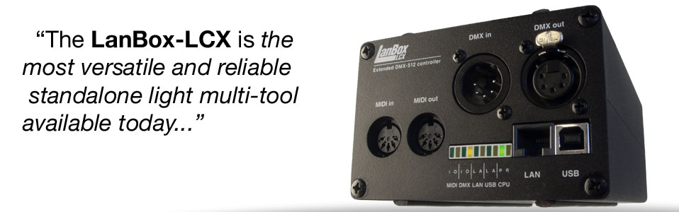 The LanBox-LCX is an autonomous and versatile DMX controller that can be implemented in almost every application that requires stand-alone operation of DMX lighting, MIDI, RS-232 and other equipment. The LanBox-LCX can be programmed and controlled using the free software LC-Edit for Mac and PC, or via third party software like Max/MSP, Isadora, Ableton or other software that allows programming of MIDI and TCP command. For the LanBox-LCX there is an extensive set of manuals, examples and tutorials.